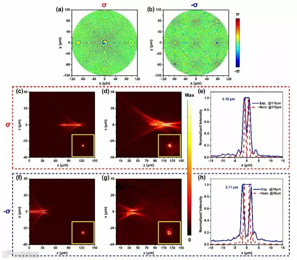 (e)和(h)两种自旋态数值模拟及实验测量焦点强度截面图。