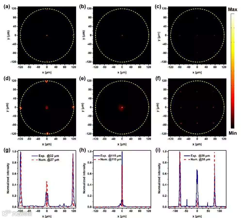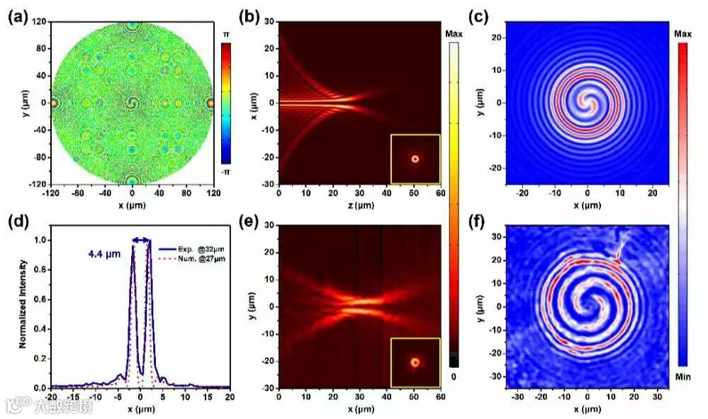 最后,由于聚焦的相位因子并非严格的双曲型相位,而是抛物线型相位,根据该团队之前的理论工作(Phys. Rev. Appl. 8, 014012 (2017).),这种聚焦相位会每隔一段距离产生新的焦点,且各焦点的强度是一致的。本工作在实验上证实了这一结论,观测到了二维的多焦点透镜。