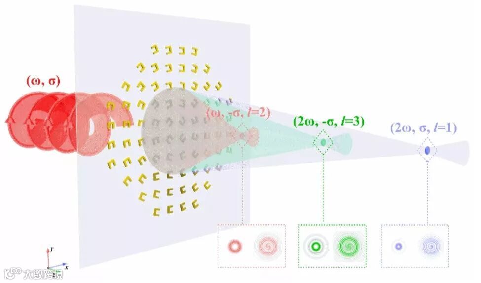 总而言之,这种利用非线性超表面实现高存储容量涡旋光器件的思路为在光通讯中的高存储容量器件、多通道的光学操控以及信息加密提供了新的方案。并且信道容量能够通过引入更多的非线性过程(例如三次谐波)进一步提高。