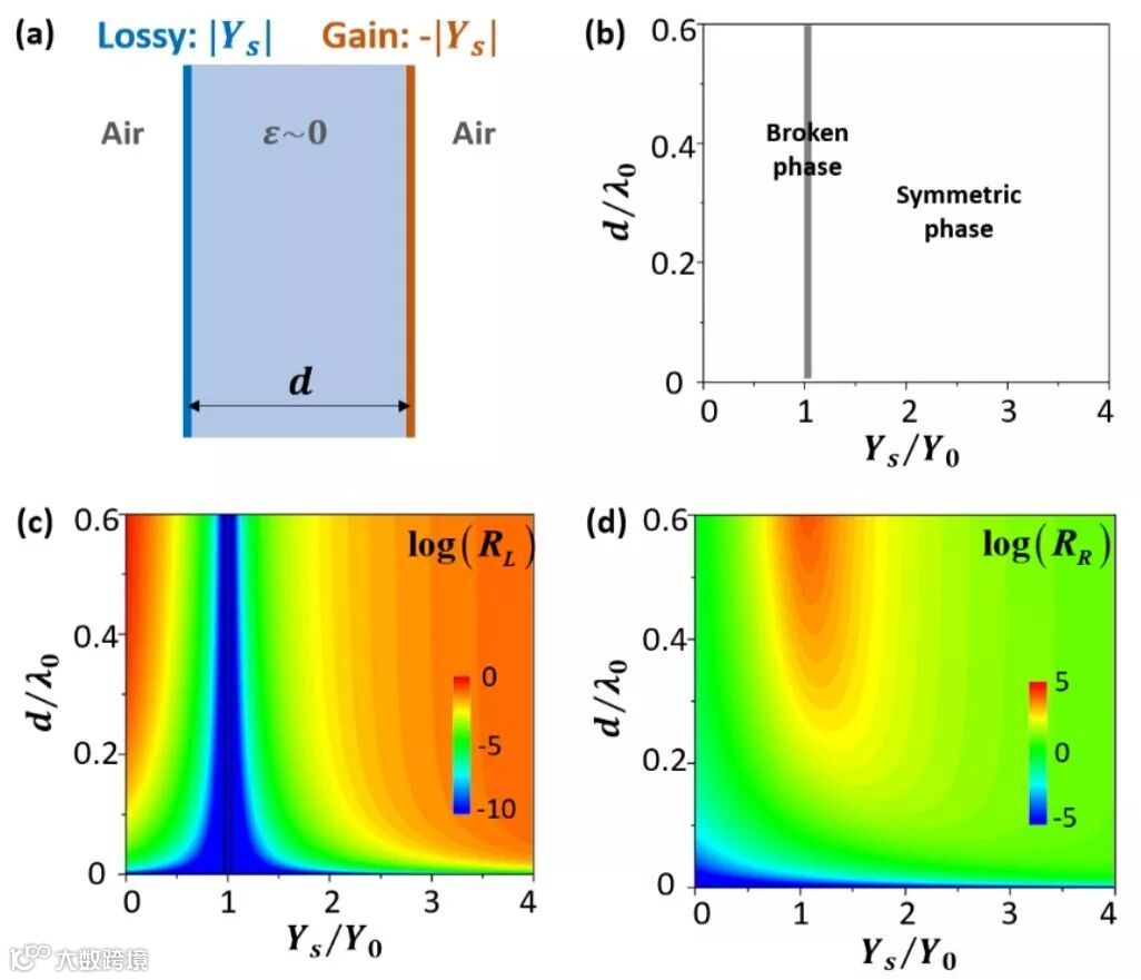 具体来讲,该研究的理论模型是由一对具有满足PT对称性的超表面与任意厚度且含有任意杂质的零折射率材料组成的“三明治结构”,如图1所示,其中左侧和右侧的超表面分别为具有损耗和增益特性的超表面。当零折射率材料中不含杂质,该PT对称体系有如下特性:1)存在两类与零折射率材料厚度无关的奇异点(exceptional point),即为PT对称相与PT对称破缺相的边界,如图2(b)所示;2)这两种奇异点具有完全不同的物理机理,一类奇异点对应于PT对称超表面工作在相干完美吸收(coherent perfect absorption)-激光(lasing)条件下,而另一类奇异点对应于PT对称超表面工作在减反膜(antireflection coating)的条件下;3)当零折射率材料的介电常数逐渐趋于零,这两类奇异点将合并为一个,如图2(b)所示;4)在奇异点处,存在单向透明现象(unidirectional invisibility),即对于两边入射的电磁波的透射率都为1,而左边/右边入射的电磁波的反射率为零,如图2(c)和2(d)所示。
