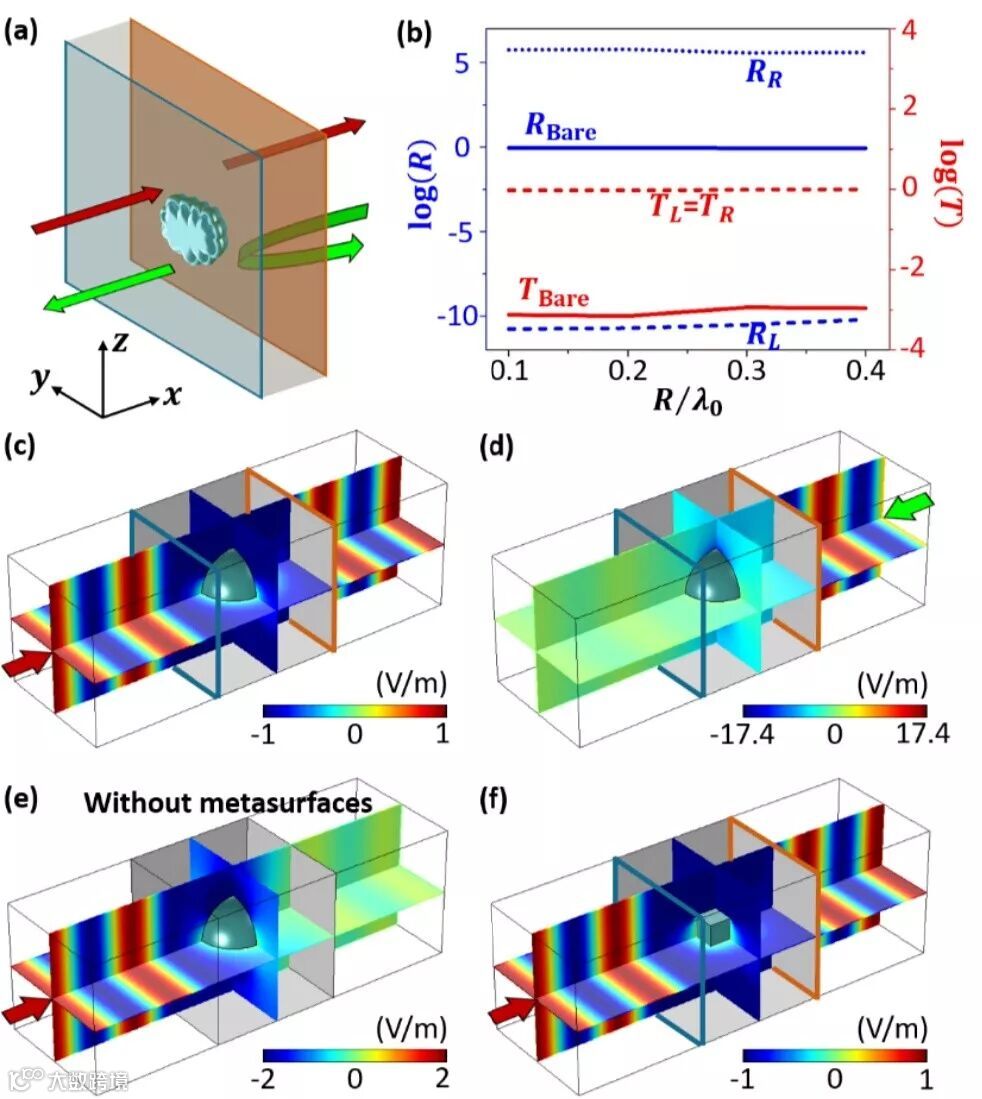 图3. 含三维有限大杂质时的电磁特性。(a)含三维有限大小杂质的理论模型。(b)杂质为半径为R的电介质球体时的反射率和透射率,可以看到,在有PT对称超表面存在,且满足奇异点的情况下,即使改变杂质球的半径,从两边入射的电磁波的透射率都始终趋于1,而从左边入射电磁波的反射也是种接近于零。(c)数值模拟验证电磁波从左边入射的完美透射的情形。(d)电磁波从右边入射,此时存在很大的反射。(e)在不存在PT对称超表面的情况下,杂质球会对透射有很大的影响。(d)杂质由介质球换成为金属方块,可以看到,含三维有限大小杂质,电磁波从左边入射下的反射率始终接近于零,而透射接近于1。