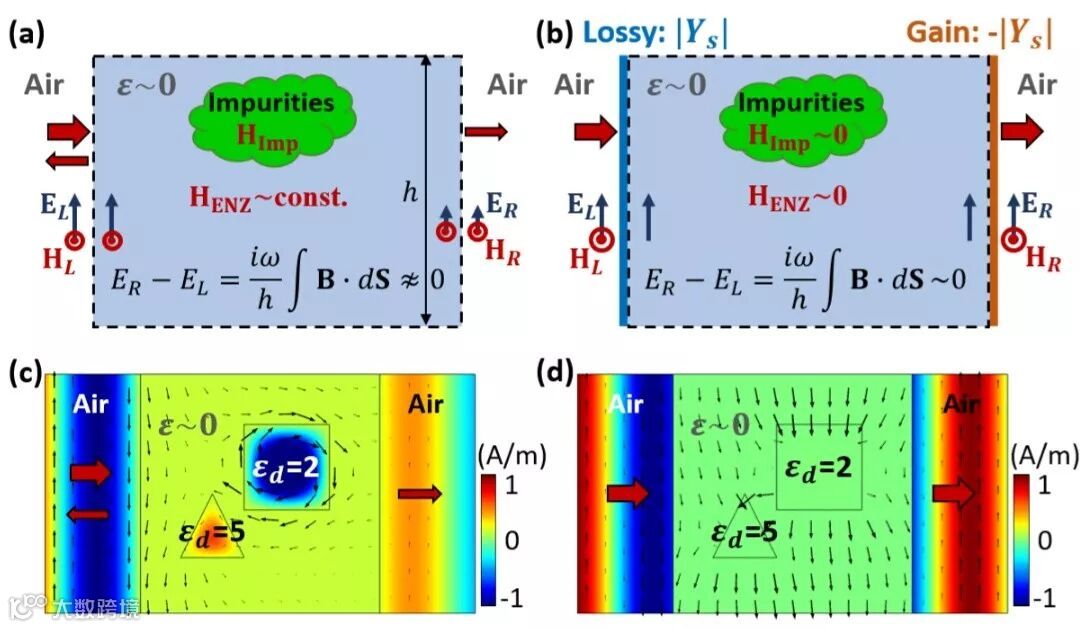 图5. 光子掺杂系统和杂质免疫系统的物理机理。(a)不含PT对称超表面的光子掺杂系统物理机理的示意图。由于零折射率材料的介电常数趋于零,横磁波的磁场将为均匀场,且磁场的大小随杂质中的电磁共振而发生变化,如图(c)所示,因此,出射界面和入射界面处的电场关系将会随着缺陷的性质而发生变化,最终导致整体的电磁特性依赖于零折射率材料中的杂质。(b)含有PT对称超表面的杂质免疫系统的物理机理示意图。类似于光子掺杂系统的情形,杂质免疫系统中零折射率材料中的磁场同样也为均匀场,但不同之处的是,此时的磁场趋于零(远小于入射波的磁场),如图(d)所示。这是因为在奇异点时,PT对称超表面能够消除零折射率材料和空气界面上的反射波(如图2(c)所示),但同时保持电场大小不发生变化(因为超表面的厚度远远小于波长,且相对磁导率为1),而零折射率材料具有趋于无穷大的阻抗,最终导致其中的磁场趋于零。由于磁场趋于零,整个系统的磁通量也趋于零,使得出射界面和入射界面处的电场始终相等,同时磁场也相等,因此透射率始终趋于1,且对其中的杂质免疫。