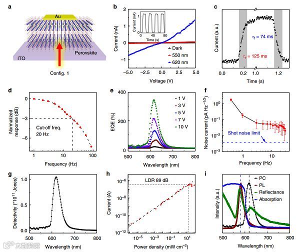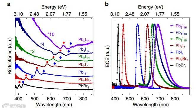 近日,华中科技大学的李德慧教授(通信作者)课题组利用二维钙钛矿材料制作了具有高度可调性能的窄带光电探测器,具有高的量子效率(200%),低的暗电流(10-12A)和高的开关比(103)。通过改变钙钛矿中的卤素原子成分和无机结构层数,探测器可以工作在可见光波段,且所有探测器的响应半高宽都小于60 nm。