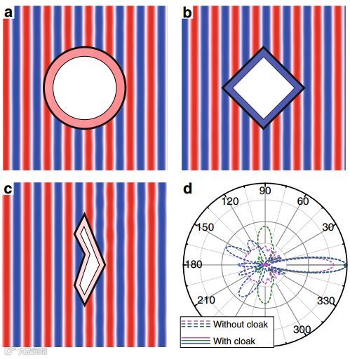d.在隐身斗篷存在(实线)和不存在(虚线)情况下的散射波远场辐射模式。