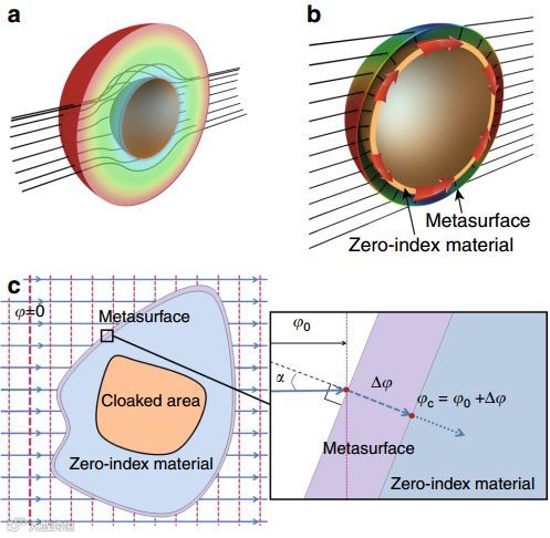 b.超表面和零折射率材料组成的复合隐身斗篷的示意图;