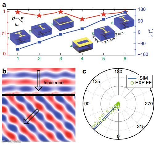 a.6个超表面基元的透射波幅值和相位变化的模拟结果;
