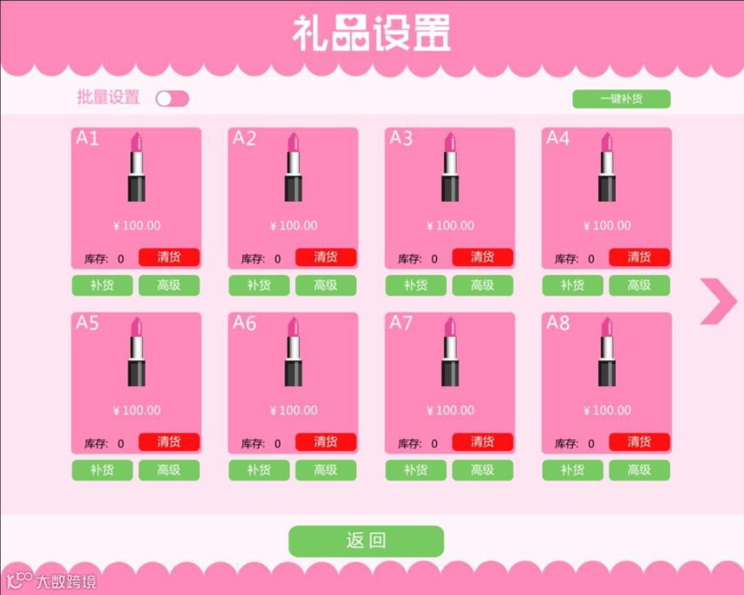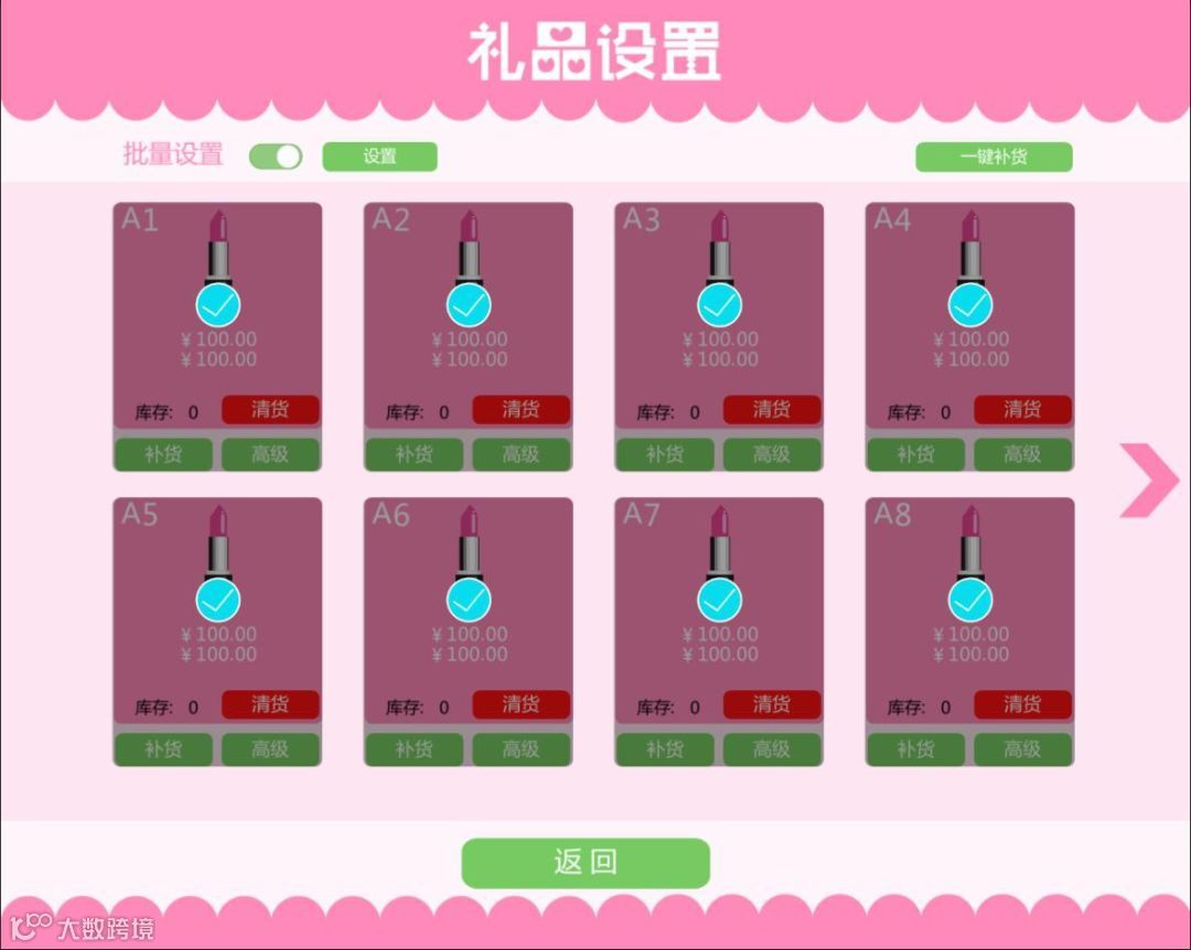 批量设置:打开批量设置后,可批量设置当前页所选中货道的游戏价格和购买价格。
