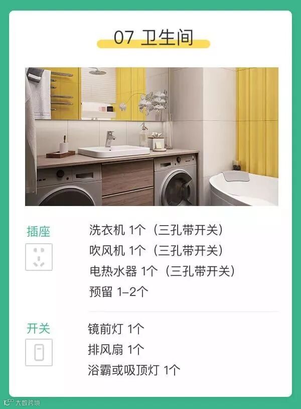 所需插座:预备2个以上五孔插座,智能马桶旁、镜柜旁的剃须刀、吹风筒等都要用到,靠近水源处一定要带防溅面罩!洗衣机准备放在卫生间的话,也要预留三孔带开关一个。
