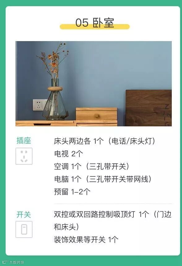 所需插座: 床头两边各一个带USB的插座(方便手机充电)但一定要买质量好的,强弱电流集成一体劣质会有安全隐患;预留两个五孔带开关插座,方便夜起感应灯、落地扇、加湿器、净化器的使用。