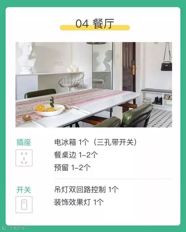 所需插座: 预留两个五孔带开关插座,热水器、咖啡机、吃火锅的电磁炉即插即用;冰箱16A三孔带开关插座一个。