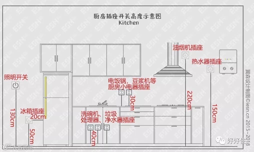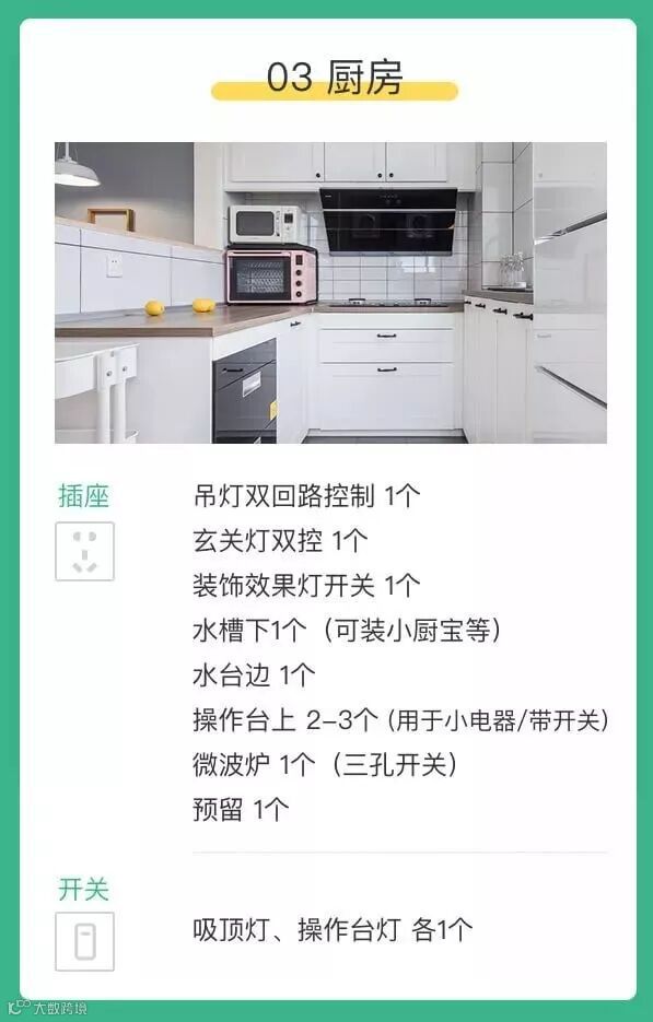 3. 厨房插座不要装在灶台上方,防止过热。还要考虑将来装厨房挂件的时候不会和开关插座位置冲突。