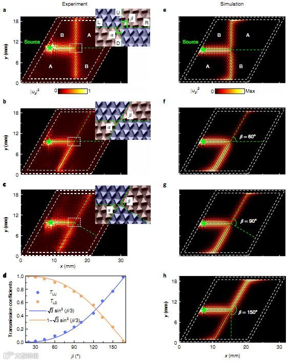 另一方面,最近有研究报道了在石墨烯通过拓扑通道交叉的谷边界态中,发现了反常的电流分流现象:边界态倾向于在最锐利的弯曲通道中传播,并且通过改变外加电场或弯曲角度,可以实现电流分配比的调制。该方法可以应用于光束分裂和干涉。然而,由于原子级制备工艺极具挑战性,在电子系统中实现谷能带电流分流的实验是很困难的。