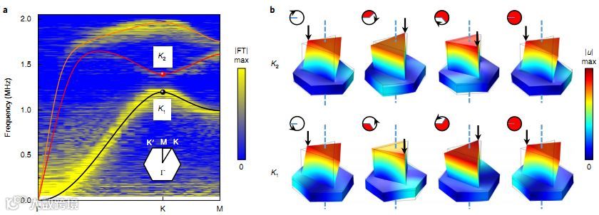 b,在相位步长为120°连续时刻,K1和K2谷态在四个单胞的位移场。