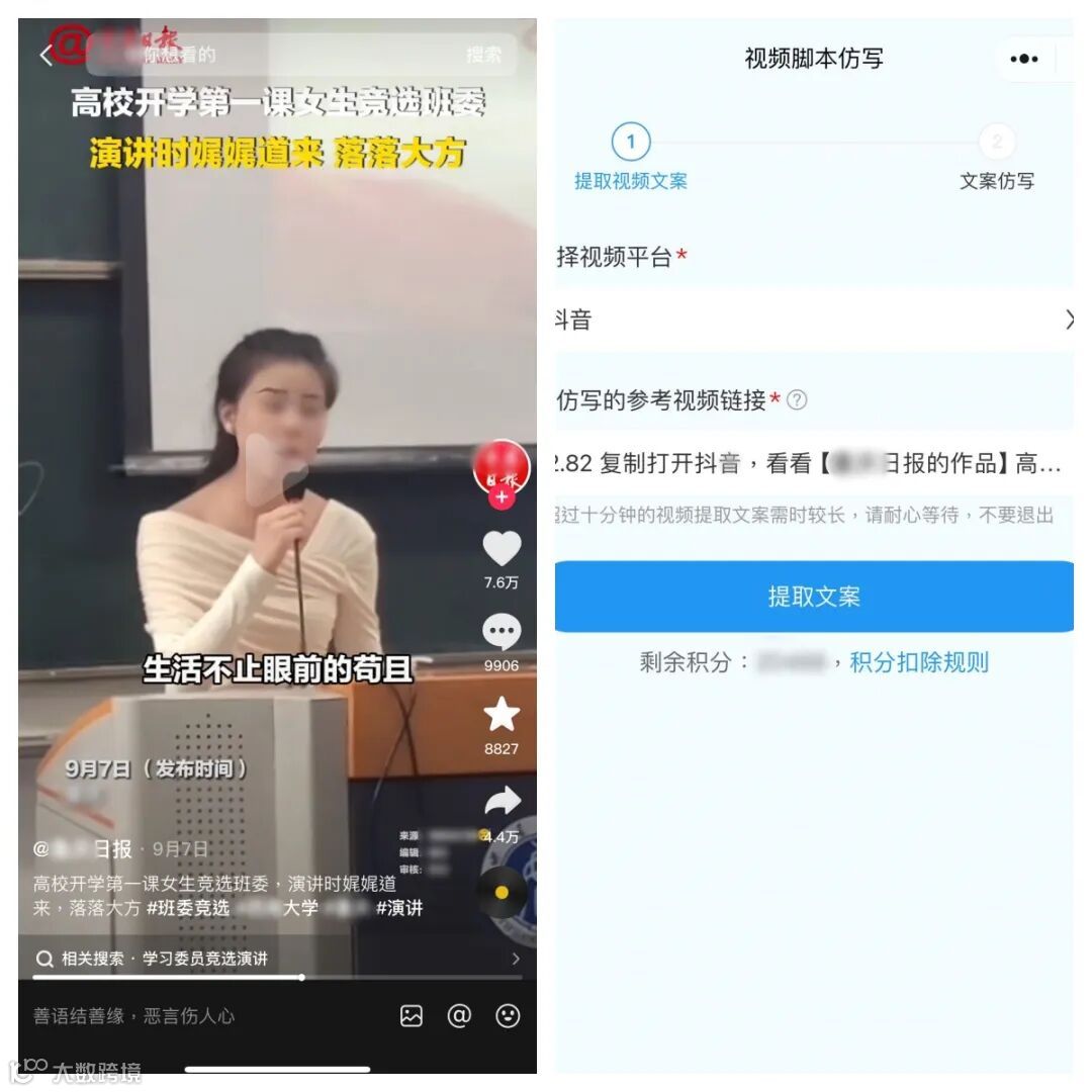灵感猎手不但能快速提取不同视频平台视频的台词对白,还能通过AI,根据不同的风格,把目标的台词内容立刻改写成自己想要的成品。
