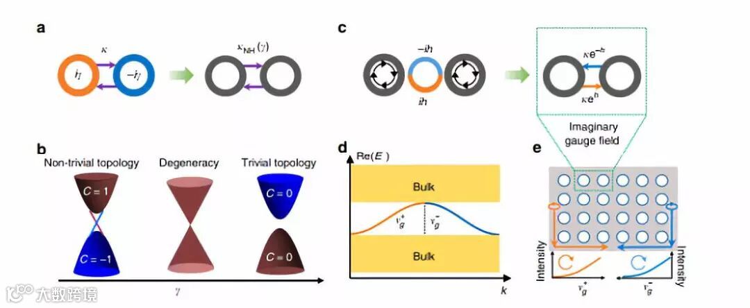 此研究工作证明了非厄米系统和拓扑系统并非独立存在,在非厄米系统中也可以出现拓扑效应。例如在非厄米系统中,与奇异点相关的π-Berry 相也具有半整数拓扑电荷 。这就为多功能的半扭曲矢量光束的实现打开了一扇新的窗户。此外,拓扑与非共轭概念的交融又带来了一种新的拓扑相变,即当两个相对电荷的奇异点合并时,拓扑电荷就会消失。而且,与规范场累积相位的不平衡形成对比的是,这种突破性的非厄米调制能够产生一个等效的规范场,受这种虚矢量势制约的光子可以沿着轨道积累一个虚相位,并根据它们的行进方向发生放大或衰减。如图2c-e所示,通过将两个谐振器与一个非厄米反共振环连接起来,可以实现虚拟规范场与定向耦合。这种规范场最大的价值在于,即使在杂质散射的情况下也能够实现完美传输。这是因为当使用虚规范场时,背散射波是衰减态(而不是传播态)。