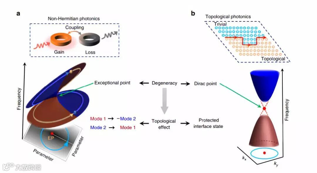 当厄米系统的哈密顿量依赖于参数时,由绝热定理可知,除了贝里相位(Berry phase)的全局相变,在参数空间中,系统经缓慢的循环演化还可回到初始位置。在某些能量非守恒系统(具有开放边界的系统)中,伴随着能量增益(如通过激光泵浦)和损耗(材料吸收或光辐射),其复杂的光谱中往往存在着一个奇异点(EP)简并。即当系统参数被调谐到临界点时,在该临界点处会出现两个或多个共振频率,使得其线宽和对应的模式轮廓(mode profiles)同时发生合并。