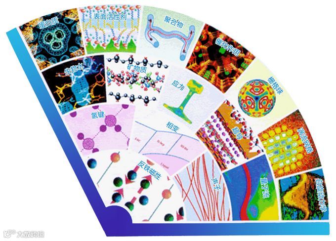用于中子散射的中子,波长从几埃到几十埃、能量在毫电子伏特到电子伏特之间,分别与物质中原子分子之间的距离和相互作用能量相当。由于中子不带电、具有磁矩、穿透性强,能分辨轻元素、同位素和近邻元素以及非破坏性等特性,中子散射成为研究物质结构和动力学性质的理想探针之一,在磁性凝聚态物理、纳米材料、高强度高性能塑料、蛋白质和生物、高温超导机理、同位素辨识、工业无损深度探伤、污染及废料处理等领域得到了广泛应用(图2)。