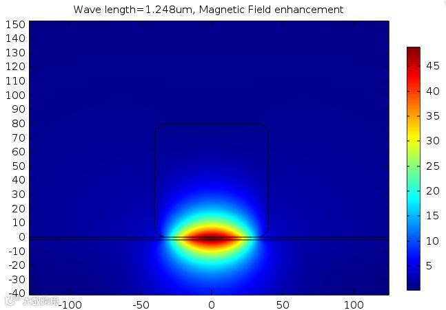 我们画出谐振波长1240nm下磁场的增强效果: