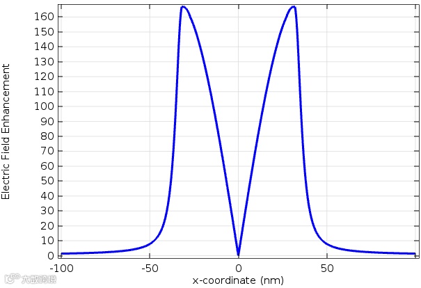 上图显示介质层中电场的增强系数仅有160,比文章中结果差很多。另外比较上面两图,磁场的单峰对应于电场的双峰,即是▽×E = H的旋度关系造成的,数学上很好解释。