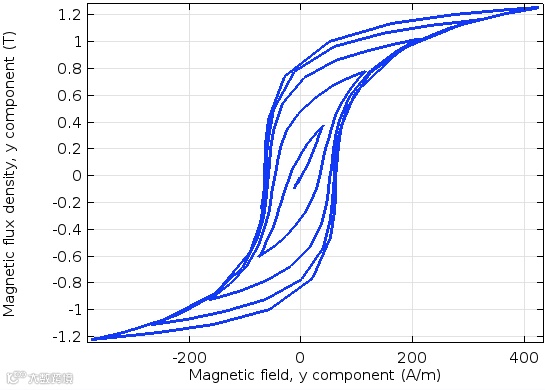 非线性是自然界一种普遍现象,有的非线性非常有害,如喇叭或者麦克风等声学设备中的谐波失真,有的则是非常有用的工具,如铁磁材料的磁滞现象。可以毫不夸张地说,正是这种磁学非线性在信息存储方面的普遍应用,才构成我们现代的文明社会。一般而言,宏观上描述这种铁磁非线性过程的数学模型有很多,比如Jiles- Atheron (JA)模型,Preisach模型,在Comsol软件新版本5.3a版本中,ACDC模块的软磁材料本构增加了JA模型,可以通过七个参数(包括饱和磁强、钉扎系数等)来对铁磁材料的磁滞效应进行有效地仿真,下图即是该模型瞬态仿真铁磁材料HB关系: