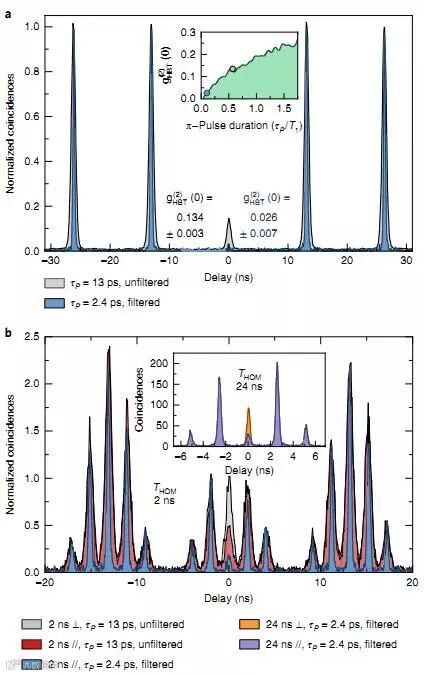 a, 使用13 ps(灰色)或2.4 ps(蓝色)脉冲测量单光子纯度;