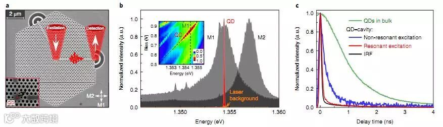 他们把量子点纳米晶体放置在一个更大的“光子晶体微腔-半导体芯片”系统中,用激光轰击量子点使其吸收能量,这种能量以光子的形式发射。将纳米晶体放置在非常小的微腔内,使激光在其内部不断反射,从而加速了基于Purcell效应的光子的产生。但是携带数据信息的光子很容易与激光混淆,为解决这一问题,他们将光子从腔体和芯片内部分离出来,从而实现两种不同类型脉冲的分离。