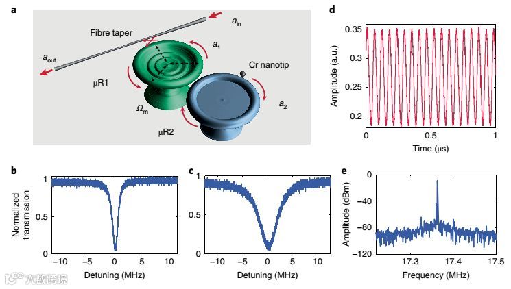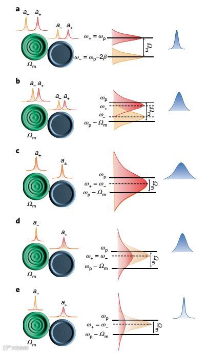 第一列显示了两个谐振器中光学超模a±分布的示意图。第二列说明了两个光学超模a±的频率差和线宽。最后一列表示声子激光器的线宽。阻尼率γtip从a到e逐步增加。