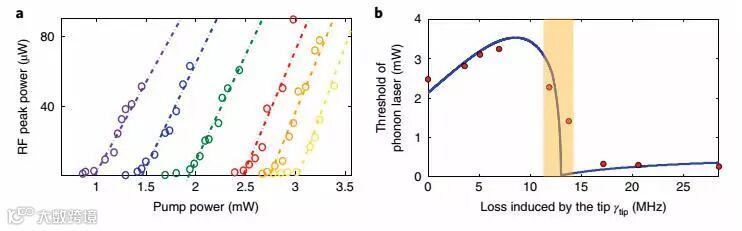 a, 声子激光器在不同阻尼率γtip下的功率谱;