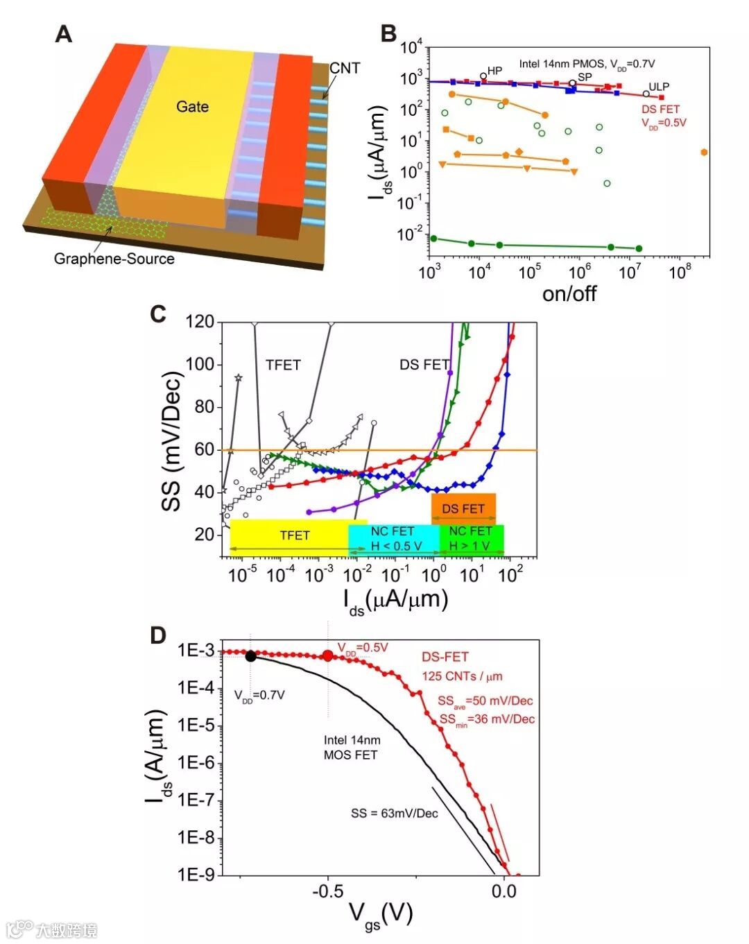 在此基础上,研究人员采用n型掺杂的石墨烯作为源端,采用p型碳纳米管作为有源沟道,实现了只需要单个栅电极工作的狄拉克源晶体管(图3),能够在室温工作环境下简单、稳定的实现40毫伏/量级的亚阈值摆幅,研究人员还将DS-FET的沟道长度缩减到了15纳米,仍然很好的展示了亚60毫伏/量级的亚阈值摆幅。