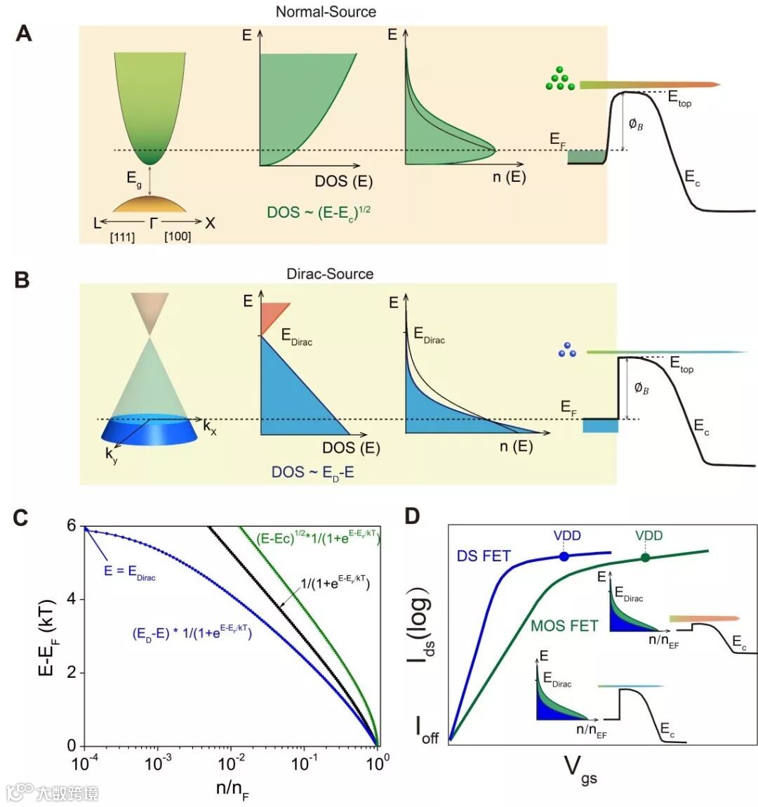 FET晶体管源端的热激发效应使得一部分载流子的能量高于沟道势垒,从而形成漏电流。因此MOSFET器件的亚阈值摆幅极限由源端载流子能量分布(热激发的带尾)情况所决定,载流子的分布由能态密度(单位能量的状态数)和费米分布函数(状态被填的几率)的乘积来决定。传统晶体管中的源端材料主要是中掺杂半导体或者金属,其态密度随着能量的增加而增加,导致费米能级上载流子浓度随能量的衰减比费米分布函数慢,从而使得室温下(300K左右)MOSFET的亚阈值摆幅大于60毫伏/量级。如果采用一种新的源端材料,其载流子态密度随着能量增加而减小,那么费米能级上的载流子浓度就会比费米函数衰减更快,有可能实现室温下(300K左右)MOS晶体管的亚阈值摆幅小于60毫伏/量级。