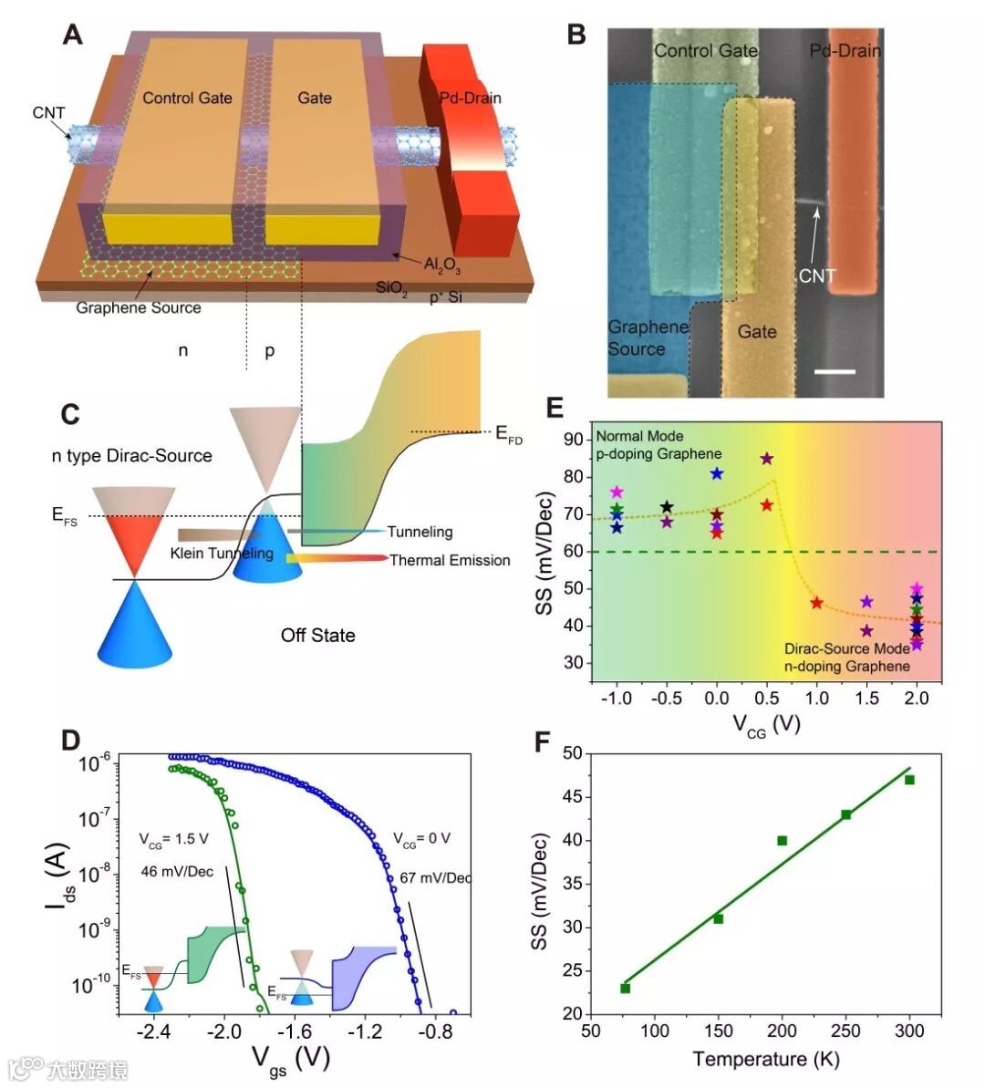 北京大学纳米器件物理与化学教育部重点实验室张志勇-彭练矛课题组重新审视了MOS晶体管的关断机理,提出了一种新的超低功耗晶体管:狄拉克源晶体管(Dirac source-FET, DS FET),即采用态密度能量减小(热载流子较少)的材料作为源端来构建晶体管,实现室温下亚60毫伏/量级的场效应晶体管。具体来说,研究人员采用具有特定掺杂的石墨烯作为源端,作为一个“冷”的电子源,用碳纳米管作为有源沟道,并采用高效率的顶栅结构,构建了新型的狄拉克源晶体管。为了演示狄拉克源的效果,构建了一个控制源端石墨烯掺杂的控制栅(见图2, control gate),对于p型晶体管,当控制栅加0V或者正电压时,源端石墨烯费米能级在价带,晶体管处于正常工作模式,室温下亚阈值摆幅大于60毫伏/量级;如果控制栅加负电压,源端石墨烯费米能级在导带(空穴浓度随能量增加而减少),晶体管处于DS工作模式,室温下亚阈值摆幅小于60毫伏/量级。变温测量结果显示DS-FET的亚阈值摆幅与温度呈现明显的正比关系,表明关断晶体管的是传统的热发射机制,而不是隧穿机制。
