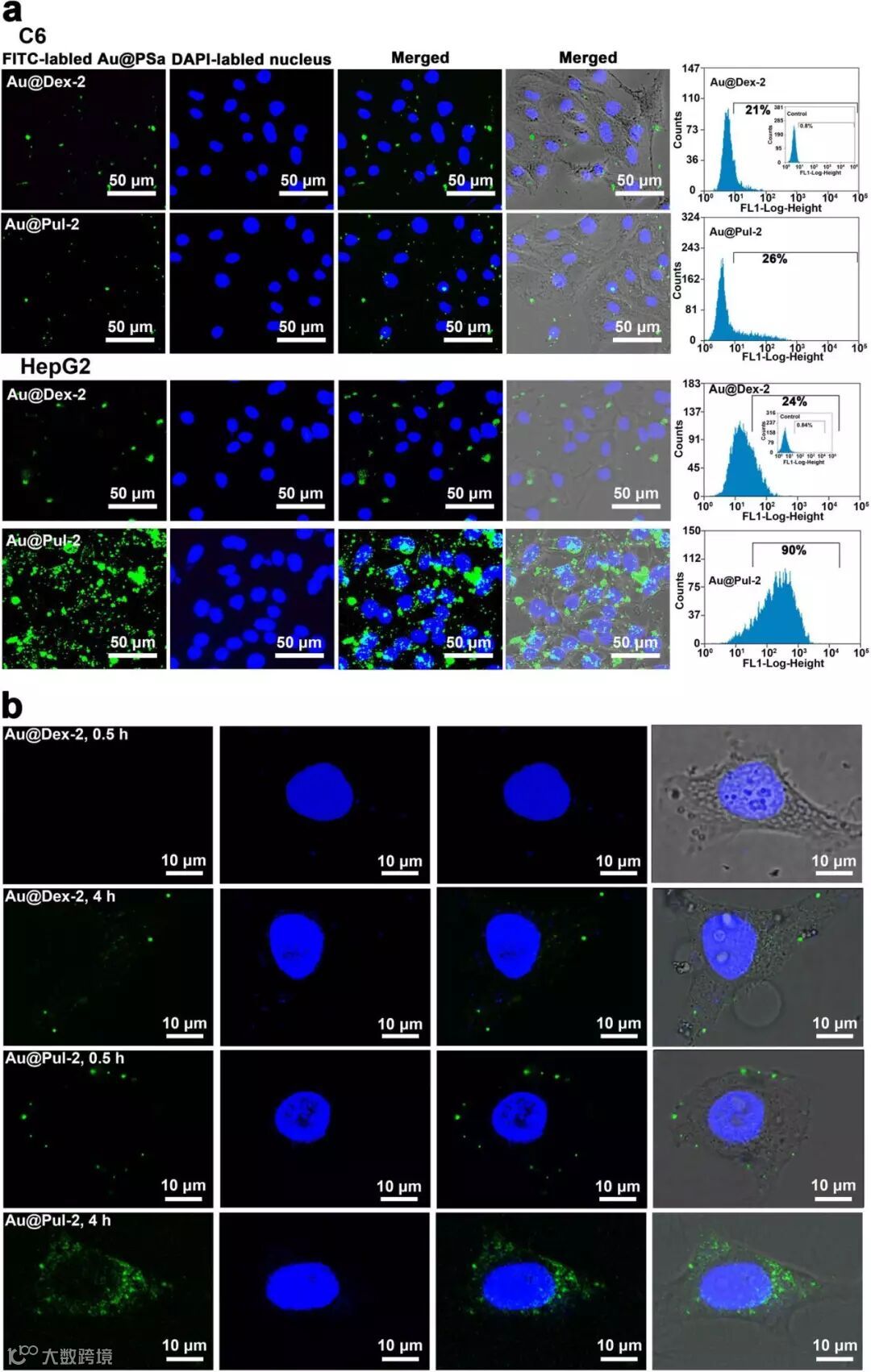 a:分别用Au@Dex-2和Au@Pul-2处理C6和HepG2细胞4h后的荧光图像和流式细胞术分析结果;
