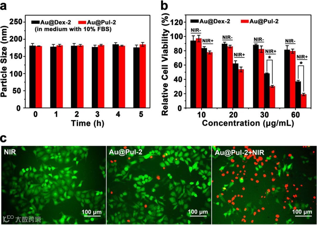 a.Au@Dex-2和Au@Pul-2在10%胎牛血清(FBS)培养基中的粒径随时间的变化图像(平均±SD,n=3);