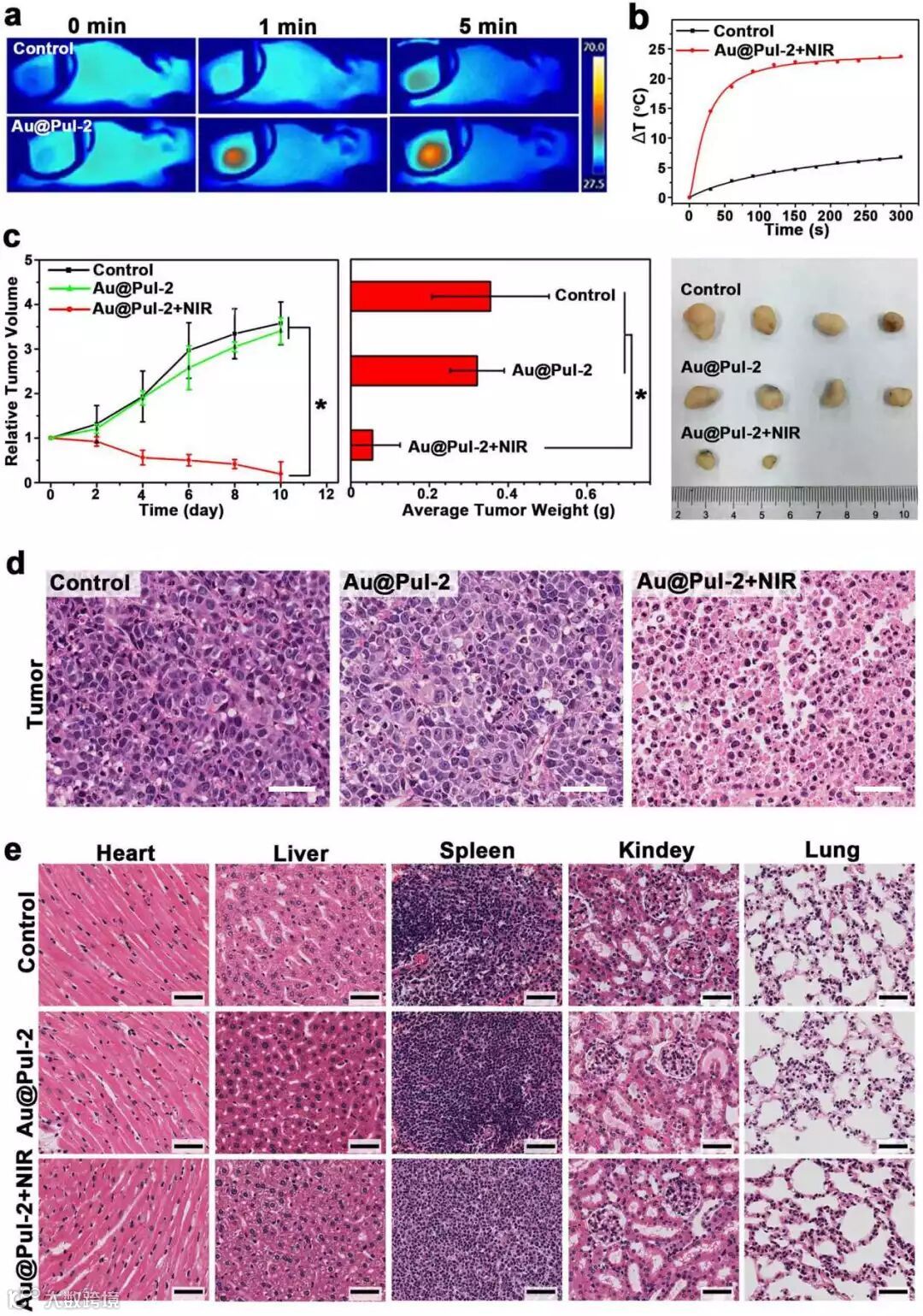 a,b.在有无808 nmNIR光源照射下,将PBS(作为对照组)或Au@Pul-2注射到HepG2荷瘤小鼠体内得到的红外热像(图a)和温度变化(图b);