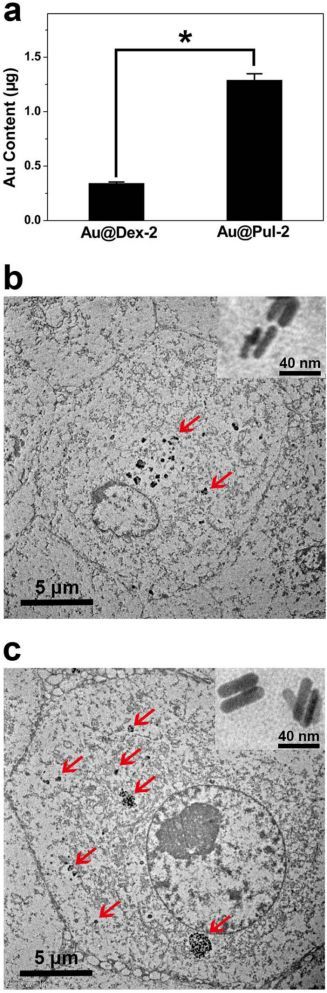 a.定量分析:用电感耦合等离子体质谱(ICP-MS)测定HepG2细胞中Au@Dex-2和Au@Pul-2的An含量(存在显著性差异,P<0.05);