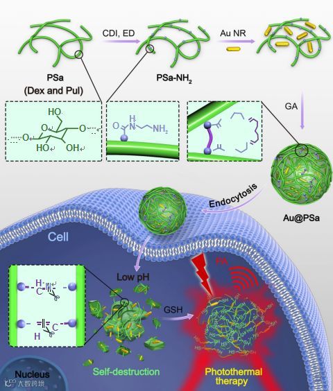 光热疗法是近年来兴起的一种新型治疗癌症的方法,纳米材料在其中扮演着肿瘤杀手的角色。近日,北京化工大学徐福建教授、赵娜娜教授研究团队以及美国芝加哥伊利诺伊大学的程刚教授共同合作,成功制备了多种包封金纳米棒的自毁性多糖纳米复合材料(记作Au@PSa),并将其作为关键的光热转换材料有效应用到了癌症的光热治疗系统。这种复合材料具有自适应的自毁特性,可以在细胞质基质中释放包封的金纳米棒,并且数量可以控制。与传统疗法相比,Au@PSa具有更高效的光热转换效率以及优异的光热效应,在癌症治疗中表现出了良好的治疗效果[1]。相关成果以“Self-destructible polysaccharide nanocomposites with unlockable Au nanorods for high-performance photothermal therapy”为题发表在NPG Asia Materials杂志上。