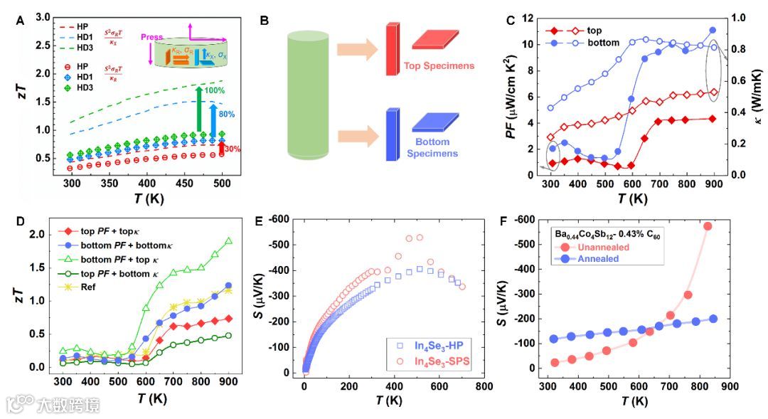 图3 材料的各向异性、不均匀性和不稳定性对热电性能测量的影响。(A)Bi2Te2Se的zT随温度的关系。HP表示热压,HDx表示x次热锻;虚线表示不同方向测量高估的zT,点表示正确的zT。(B)Cu1.97Se0.5S0.5铸锭样品及上下端待测试样示意图。(C)不同位置试样的功率因子(左轴)和热导率(右轴)、(D)zT值随温度的变化。(E)In4Se3和(F)Ba0.44Co4Sb12/C60复合材料的塞贝克系数随温度的变化。