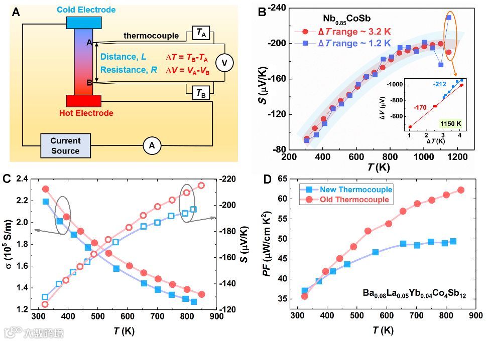 图1A给出了商用设备ZEM和Linseis测量塞贝克系数和电导率的示意图。在给定温度梯度下,样品A和B两点的温度和温差(