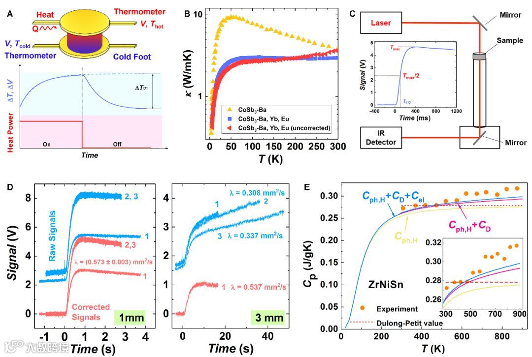 图2 热输运参数测量。(A)TTO/PPMS两探针低温热导率测量示意图(上图),加热功率和背面信号随温度的变化。(B)热电偶校正前后方钴矿低温热导率测试结果。(C)激光闪射法测量热扩散系数示意图。(D)Cu2Se样品背面原始信号和修正信号,左图样品厚度为1 mm,右图样品厚度为3 mm。图中数字表示每次测量计算得到的热扩散系数。(E)ZrNiSn比热:点表示LFA测试结果,波动很大,曲线为计算结果。