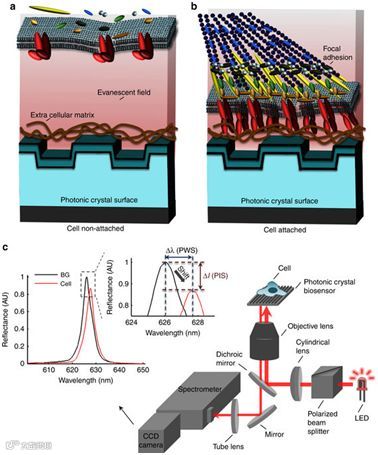 局部粘连(Focal adhesion)是调节粘连和迁移性质的关键细胞膜成分,具有与粘附接触和迁移速度密切相关的簇尺寸(cluster dimension)。来自伊利诺伊大学厄巴纳-香槟分校的研究人员利用光子谐振耦合输出显微镜(photonic resonator outcoupler microscopy, PROM),实现了对细胞表面相互作用的动态、长期、定量的无标记光学成像,其中细胞膜蛋白聚集的耦合输出光来自于光子晶体生物传感器(photonic crystal biosensor)的共振消逝场(resonantevanescent field),导致了反射光强度的高度局部化降低。通过映射来自生物传感器表面的共振反射峰强度的变化,他们验证了PROM定量分析局部粘连力的能力,获得了与荧光标记图像一致的实验结果。特别的是,他们证明细胞表面接触(cell–surfacecontact)和居域粘连形成(focal adhesion formation)可以通过PROM中的两个正交无标记技术实现同时成像,从而为细胞与基底膜相互作用的动力学、高轴向分辨率监测提供了通用的检测工具。相关成果发表在近期的《Light:Science & Applications》上。