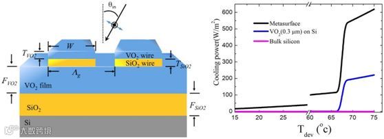 近年来,利用等离子体超材料(plasmonicmetamaterial)来控制材料的热辐射性能(thermalemission)受到了高度关注。一系列的研究工作表明:可以通过调节超材料的结构参数,改变材料整体的热辐射性质,将红外发射波长调整为大气的透明窗口(transparencywindow of the atmosphere),能够实现基于辐射效应的冷却效果。基于该原理的辐射冷却不需要额外的能量输入和机械传动装置,相对较低的成本更引起了人们的极大研究和产业化兴趣。近日,来自台湾国立东华大学的Chih-Ming Wang教授课题组提出了一种基于二氧化钒VO2相变材料的可调式中红外超表面结构的温度控制方法。他们构建出一种VO2/ SiO2 / VO2的多层超表面材料,通过可实现热切换调节的“法布里-珀罗”共振模式,将超表面的辐射波长调整至大气的透明窗口。从理论上来说,当器件的温度低于/高于VO2的相变温度时,超表面材料的辐射冷却功率密度可以实现高达四倍的任意切换。除了辐射冷却功能之外,他们也从理论上展现了基于这种制冷切换能力极强的无源温度控制应用,相关的可调式超表面材料可以应用于小型化的辐射冷却和温度控制应用。相关研究发表在近期的ScientificReports上。