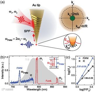 能够在足够小的空间内实现高效非线性光学混频效应(Optical FrequencyMixing)是未来集成光子器件的关键因素。然而,通常较低的转换效率严重制约了纳米级尺寸下的器件微型化。近日,来自科罗拉多大学波尔得分校和德克萨斯A&M大学的研究人员通过实验证实:梯度场效应可以提供高效的、突破传统偶极子限制(dipole-forbidden)的非线性光学响应。他们以具有渐变结构的金针尖结构为实验体系,表明纵向的非线性源电流在自由电子响应的三阶光学非线性现象中占据主导地位,并且在应用意义更为重要的近红外光学频率范围内起到至关重要的影响。使用绝热性纳米聚焦对激励光场的空间限制,他们测量得到了高达10-5的四波混频转换效率,并且测量结果与基于等离子流体动力学和电子动力学的理论非常吻合。随着样品尺寸减小,非线性转换效率将随之增加,这在一定程度上补偿了体积减小所引起的性能劣化,为增强型非线性纳米光学提供了新的方法。这个工作有望将更为高效的非线性光学器件和相干多维光谱延伸到纳米尺度,使得高性能的集成光子学器件成为可能。相关研究发表在近期的Physical ReviewLetters上。