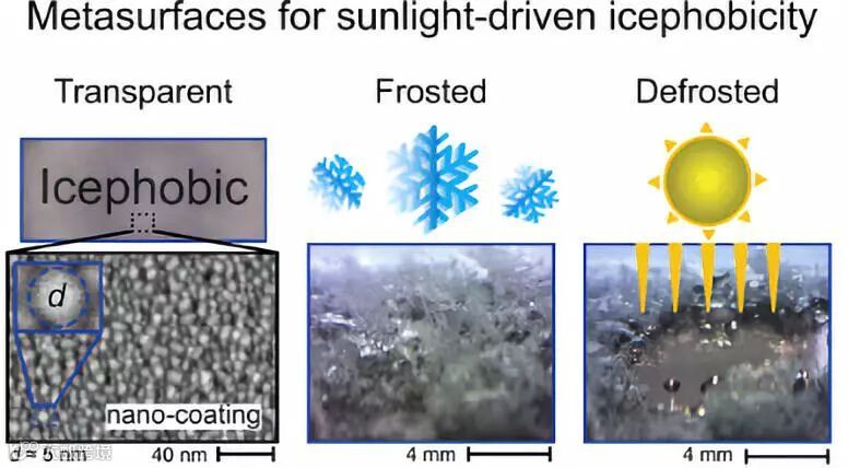 在生活和生产中的很多场合,如挡风玻璃、汽车、航空、可再生能源发电和基础设施等,玻璃表面在低温下的积冰是一个困扰人们多年的难题,很有可能带来安全隐患或者降低设备的使用性能;而通过简单的电加热、化学制剂或机械清除等方法抑制或除去积冰,则会有高能耗、高成本、破坏性和环境不相容性等问题。最近,来自苏黎世联邦理工学院的科学家利用等离子体超表面材料(plasmonic metasurface)在增强光吸收方面的优势,提出采用超薄的“金属-介电”混合涂层作为被动除冰和防冰的可行方案,其唯一的热源是可再生的太阳能,可广泛应用于需要较高透明度的场合。该涂层是由电介质(二氧化钛)中的金纳米粒子包裹体组成,可在极小的纳米尺度上实现太阳能的宽带吸,并通过合理的纳米涂层工程设计,实现了介质透明度和光吸收的平衡。研究表明,这一涂层设计使其温度增加了 10°C以上,能够在结冰形成初期延迟冻结、降低冰粘附性,从而抑制了霜冻的形成(防冰)。通过精心设计等离子体超表面的结构,能够达到透明度和光吸收的平衡,实现了环境兼容、太阳能驱动的除冰和结冰抑制。相关成果发表在近期的《ACS Nano》上。
