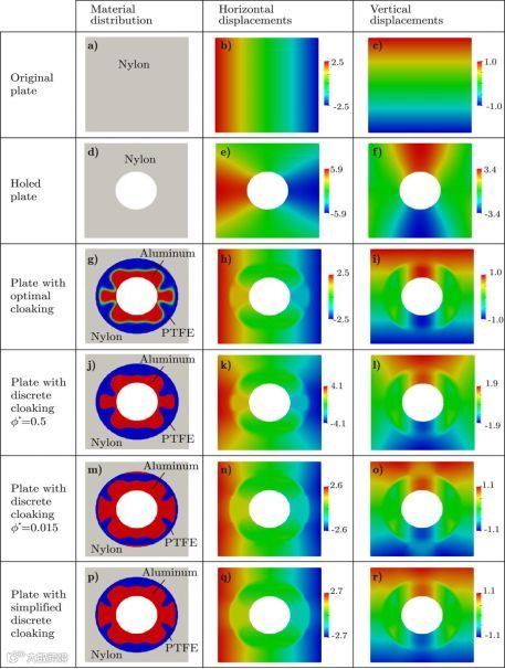 “隐身斗篷”(Clocking)是《哈利·波特》系列小说中用于隐藏物体的奇幻装置。2006年左右,Pendry和Leonhardt等人介绍了基于变换光学原理的隐身超材料的设计方法,从此开启了超材料隐身在光学、声学、热学和电学等方面的应用。然而,静态力学的隐身研究却相对较少。近日,来自阿根廷利托拉尔国立大学的研究人员提出了一种设计弹性材料位移场的隐身装置的新方法。他们以期望位移场的误差为目标函数(objective function),通过求解非线性优化问题确定了隐身装置内的材料分布特性。为了便于制造,研究人员使用离散材料优化技术,将离散化的材料设计模型转换为实际连续材料。研究表明,其所设计的器件能够以有效地操控位移场,使得内部物体不影响周围弹性体介质的位移场,从而从外部将物体“隐藏”起来。相关研究工作发表在近期的《Scientific Reports》上。