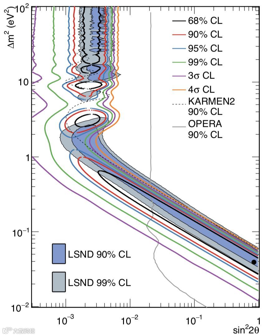 ○ 这张图是这篇新论文中的主要成果。图中显示了新结果与早期的LSND实验结果一致。灰色的线表明这个区域被其他实验“排除”了。| 图片来源:[1]