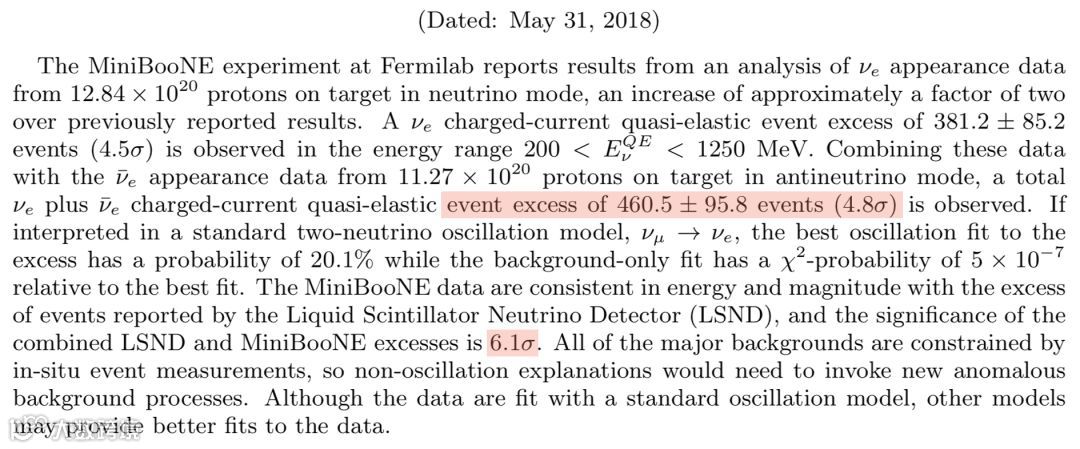 ○ MiniBooNE实验的最新结果发表于arXiv上,图中显示了论文的摘要。MiniBooNE实验结果的统计学显著性为4.8σ,仅比物理学家宣布一项新发现所需的5σ小一点。从摘要中我们可以看到,MiniBooNE和LSND二者结合得出的显著性高达6.1σ(意味着该结果是侥幸的几率约为1/5亿),尽管一些研究人员对这种说法表示一定程度的怀疑。| 图片来源:[1]