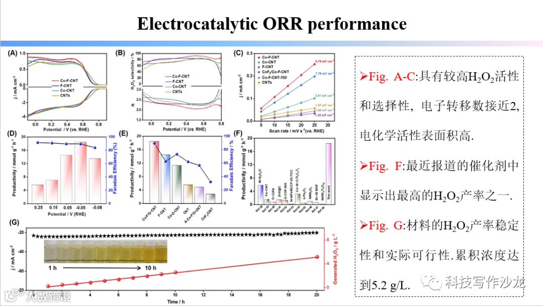 总之,我们报道了通过超快微波处理获得的Co单原子位点与仲芴杂化剂在碳纳米管上的远距离配位。通过实验和计算研究的结合验证,该策略成功地将2e-ORR的活性中心从单个Co原子转化为周围的多个碳原子,有效地增加了2e-ORR活性中心的数量和持久性。结果表明,该催化剂对2 e-ORR具有优异的电催化性能,其H2O2产率高达18.6 mol g-1 h-1,且具有良好的稳定性。本工作为多位点-ORR电催化剂的快速合成设计提供了一条新途径。