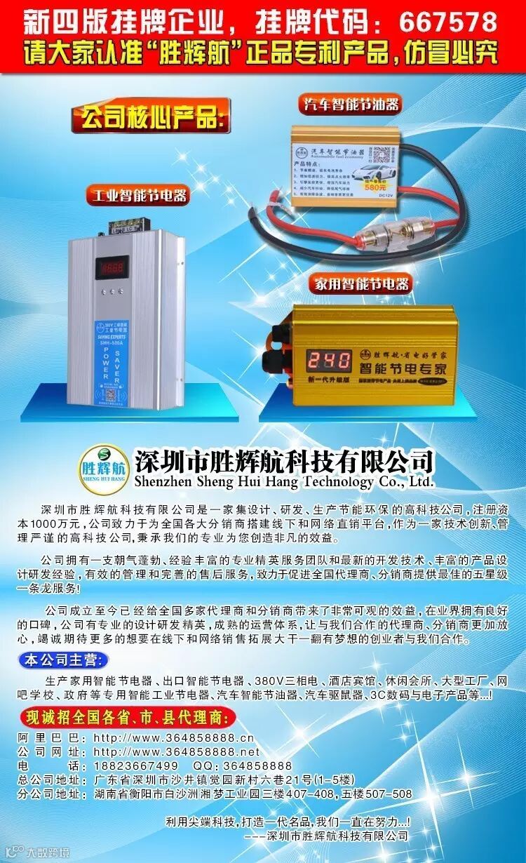 据悉;作为行业领先拥有自主品牌和多项专利专注于研发节能环保产品有节电王之称的深圳市胜辉航科技有限公司也因此成为在该交易中心挂牌的首家专注于节电、节能领域的科技公司。