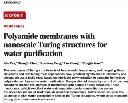 相关论文 “ Polyamide membranes with nanoscale Turing structures for water purification ”(具有纳米尺度图灵结构的水净化聚酰胺膜,DIO:10.1126/science.aar6308)5月4日在顶级科学期刊《科学》上发表。第一作者是博士生谭喆。一位论文审稿人认为:“据我所知,这是首次尝试在薄膜上制造纳米尺度图灵结构的报道。”有关图灵结构的研究正从数十年来的理论层面推进到应用领域。