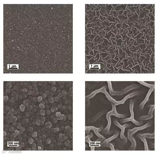 图:扫描电子显微镜下的两种图灵结构纳滤膜,左边为点状结构,右边为条状结构。(来源:课题组)